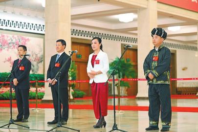 10月22日,中國共產(chǎn)黨第二十次全國代表大會(huì)閉幕會(huì)在北京人民大會(huì)堂舉行。這是閉幕會(huì)后,周海江、李國璋、張燕、施金通代表(自左至右)接受采訪。 新華社記者 金良快 攝