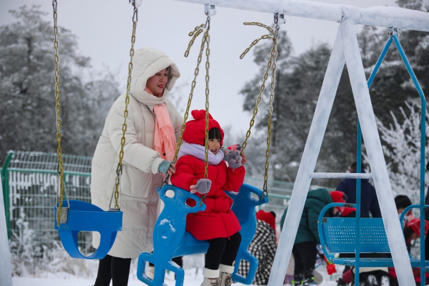 在雪中蕩秋千的游客。宣漢縣委宣傳部供圖