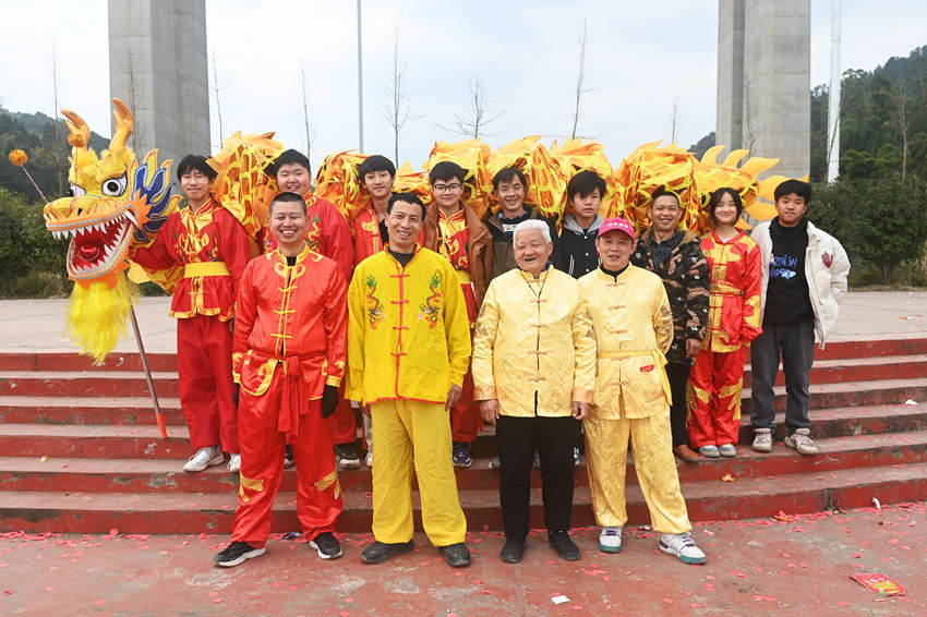 “那時(shí)候,上網(wǎng)打游戲的人不多,我們體力也好,從大年初一舞到正月十五,不僅自己玩得開(kāi)心,還把新場(chǎng)鎮(zhèn)的熱鬧氣氛帶動(dòng)了起來(lái)。如今,我們這批人都50歲上下了,敢上場(chǎng)舞龍的人越來(lái)越少。”楊光輝感慨,隨著年齡的增長(zhǎng),他的擔(dān)憂也與日俱增:擔(dān)心自己老了看不到舞龍表演,擔(dān)心這項(xiàng)傳統(tǒng)技藝失傳……于是,他找到了自己20多年前的老師——當(dāng)?shù)刂奈椠垈鞒腥颂茍蚶ず妥坑廊?/p>