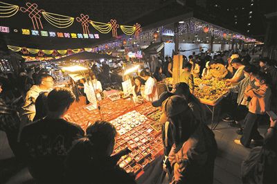 在新增的周六非遺主題夜市中,這種體驗(yàn)感尤為明顯。夜幕下,潘家園舊貨市場(chǎng)里人頭攢動(dòng)。市場(chǎng)上,一排排的攤位處熙熙攘攘,叫賣和討價(jià)還價(jià)聲不絕于耳。久違的煙火氣在這里蘇醒,不斷升騰,蔓延到市場(chǎng)的每個(gè)角落。在這里,非遺的活態(tài)展示構(gòu)筑起年輕人與傳統(tǒng)文化交流互動(dòng)的橋梁,也成為沉浸式體驗(yàn)的核心。