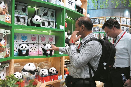 歐洲游客在成都大熊貓繁育研究基地購(gòu)買(mǎi)紀(jì)念品。