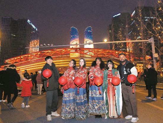 外國(guó)游客身著傳統(tǒng)中式服裝,在交子大道拍照留念。