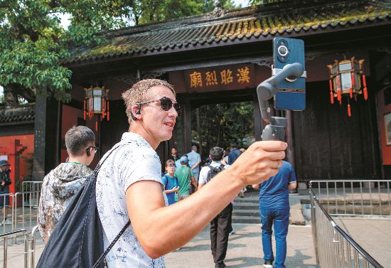 外國(guó)游客在武侯祠大門(mén)外自拍。