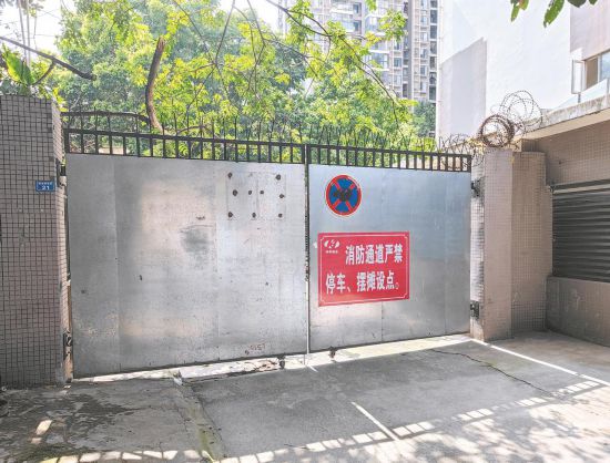 記者在位于金牛區(qū)西北橋北街的龍門鎮(zhèn)小區(qū)看到,一條寬敞的消防通道被一道鐵皮大門封閉,門上還貼著“消防通道嚴禁停車、擺攤設點”,上方禁止車輛停放的標牌已被涂黑。據(jù)地圖顯示,此處應為小區(qū)東門,透過門縫,可以看到大門被從內(nèi)部鎖住,離大門不遠處就是居民樓和運動場?!跋劳ǖ揽刹荒苌湘i,要是遇到失火,相當于封了逃生路,是要出大事的!”居民劉大姐說。