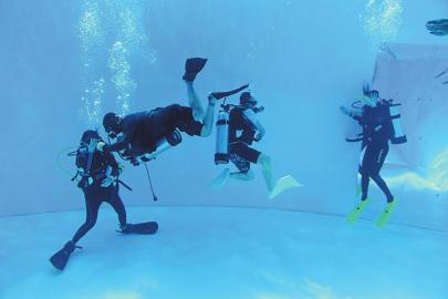 8月2日,水肺潛水學(xué)員在教練的指導(dǎo)下在25米深的潛水館中練習(xí)潛水。