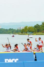 8月9日,西班牙隊(duì)在獲得龍舟8人座公開(kāi)組2000米追逐賽銅牌后歡呼。