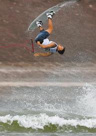 8月9日,滑水運(yùn)動(dòng)員在三岔湖賽道上完成翻轉(zhuǎn)、跳躍等高難度動(dòng)作。
