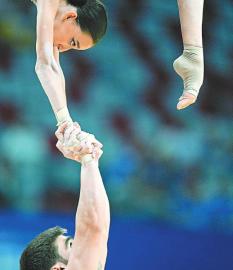 8月8日,哈薩克斯坦選手在成都世運(yùn)會(huì)技巧混合雙人比賽中展示技巧。