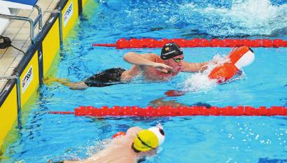 8月8日,參加4×50米泳池救生接力男子決賽的選手推動(dòng)45公斤重的假人沖刺。