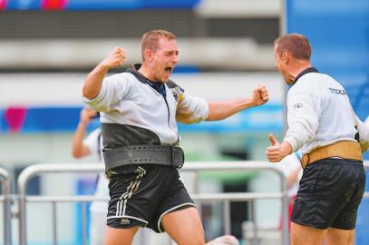 8月9日,英國(guó)隊(duì)在男子室外拔河640公斤級(jí)比賽中奪金。