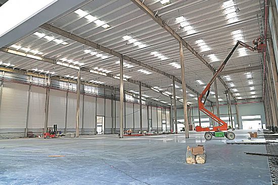 智慧云倉及冷鏈物流中心內(nèi),工人正進行墻面施工。