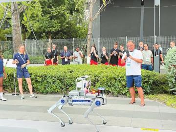 不遠(yuǎn)處,由成都交投信息科技有限公司與考拉悠然聯(lián)手打造的智能導(dǎo)覽機(jī)器狗正頂著烈日運(yùn)送行李,其防風(fēng)防雨機(jī)身與50公斤負(fù)重能力,讓它成為全天候“超級(jí)向?qū)А?,可?shí)現(xiàn)雙語導(dǎo)覽、解答世運(yùn)會(huì)知識(shí)等功能。