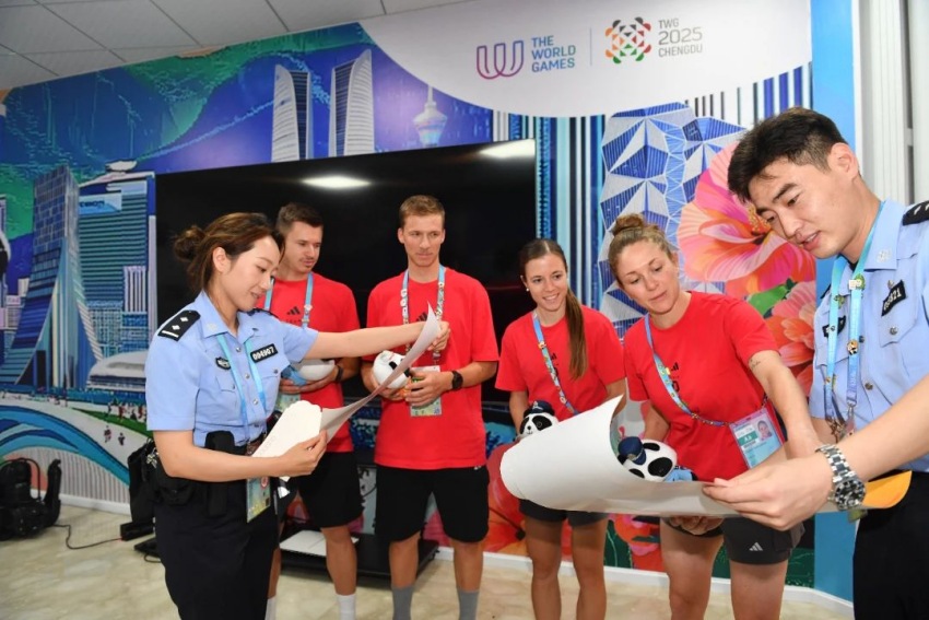 此刻,沒有語言的阻礙,只有守護(hù)者之間的共鳴。為了表達(dá)對成都公安提供賽事安全保障的感謝,Anna和隊(duì)友們拿出3張滿載簽名的世運(yùn)會主題海報(bào),鄭重地交付給龔千淋。龔千淋與同事則捧出憨態(tài)可掬的“熊貓警察”玩偶回贈。