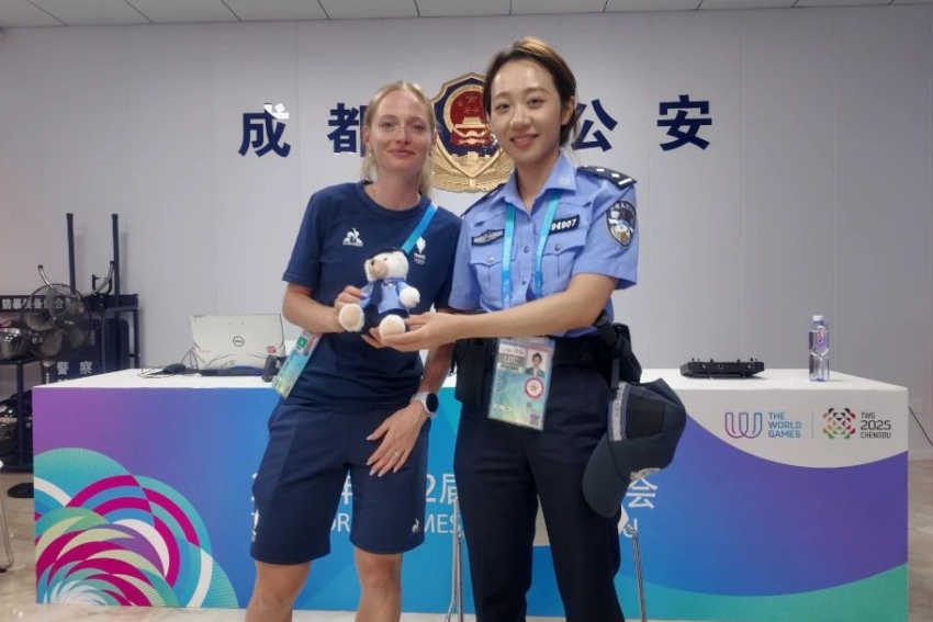 德國運(yùn)動員剛離開,法國運(yùn)動員又帶著好奇踏入警務(wù)站。當(dāng)?shù)弥渲械腖efeuvre也是警察時(shí),龔千淋微笑著將另一只警察小熊遞上,并預(yù)祝她們賽場凱旋。