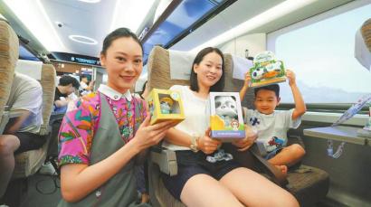 “沒想到在火車上也能買到成都世運(yùn)會紀(jì)念品,這些‘蜀寶’玩偶實(shí)在太可愛了,我要帶回去給朋友當(dāng)伴手禮!”8月15日,在成都東站開往香港西九龍站的G2963次列車上,旅客張文妍興致勃勃地挑選著世運(yùn)會文創(chuàng)產(chǎn)品。
