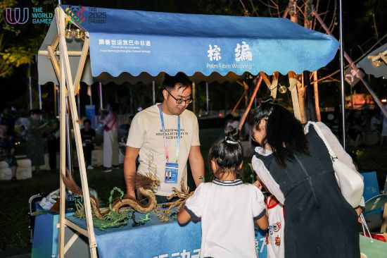 世運廣場活動期間,四川省級非物質(zhì)文化遺產(chǎn)巴山剪紙將紅色文化與生態(tài)保護等主題融入鏤空藝術(shù),反映了中華優(yōu)秀傳統(tǒng)文化和巴山兒女勤勞勇敢、積極樂觀的生活態(tài)度;源于大巴山地區(qū)的豐富竹資源的巴中竹編兼具藝術(shù)與文化價值,世運廣場上的巴中技人連續(xù)多日用竹篾向游客市民們編織出巴中光霧山風光與民俗故事;還有棕編藝人們用棕櫚葉編就的栩栩如生的動物擺件,從單編到多編的技法,讓這項古老手藝成為世運廣場上國內(nèi)外游客追捧的對象。