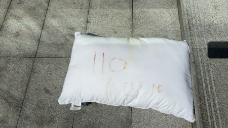8月12日下午4點(diǎn)過,周女士咬破手指,用血在白色枕頭上寫下“110 625”字樣,隨后從窗戶上扔了下去。