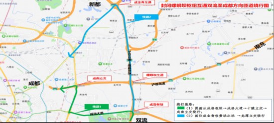 封閉內(nèi)環(huán)、外環(huán)往成都方向匝道,繞行路線示意圖