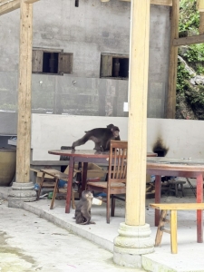 同樣受“猴患”困擾的,還有當?shù)亟?jīng)營酒店的付女士?!澳憧纯催@里都毀成什么樣了?”她指著酒店旁一處露天飯廳說道。這片緊靠山腳的區(qū)域,是猴子下山的“第一站”,飯廳里的罐子、碗、天窗玻璃早已被猴群破壞得七零八落,桌椅更是東倒西歪,一片殘破。采訪間,不時有幾只猴子在懸梁上飛檐走壁,還順著電線跳到酒店屋頂嬉戲打鬧。